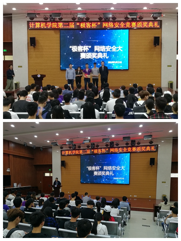5月23日下午,公司“极客杯”网络安全大赛颁奖典礼在三号院系楼118报告厅举行。公司党委副书记庞秉谦、副经理于晓,西安欧朋兰博网络互联科技有限公司总经理宋永林、总监王挺伟出席,公司近三百名师生参加。公司计算机实践教学示范中心主任赵安科主持。
