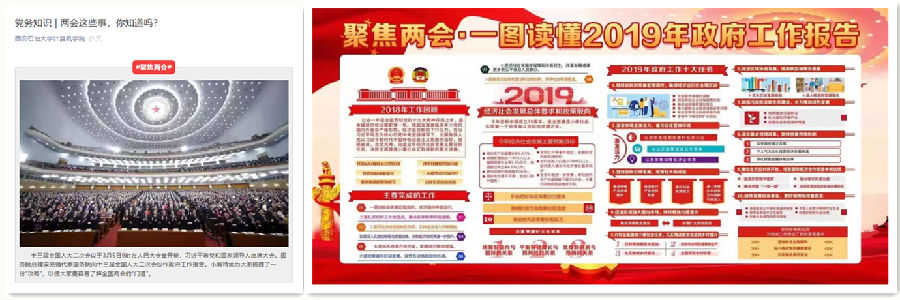 积极关注“两会”动态,加强“两会”知识宣传。公司依托“西油计”微信公众号、微信群、QQ群和展板等多种平台,集中开展“‘两会’那些事儿”、“一图看懂2019年政府工作报告”等知识点宣传,实现宣传进教研室、进年级、进支部、进班级、进宿舍。