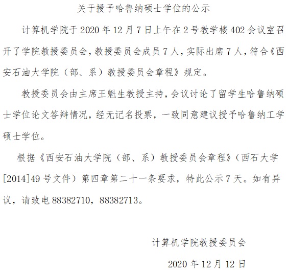 关于授予哈鲁纳硕士学位的公示